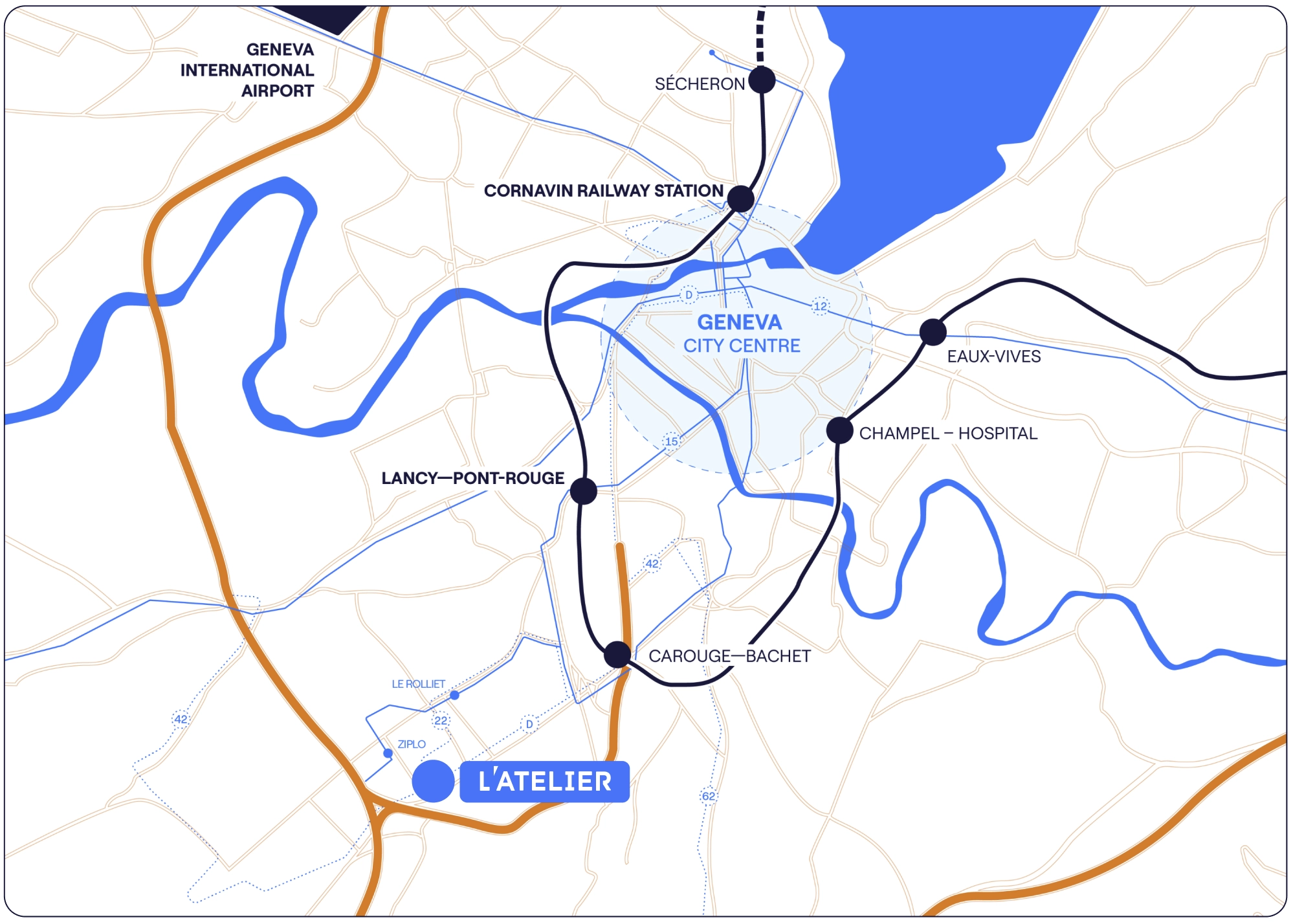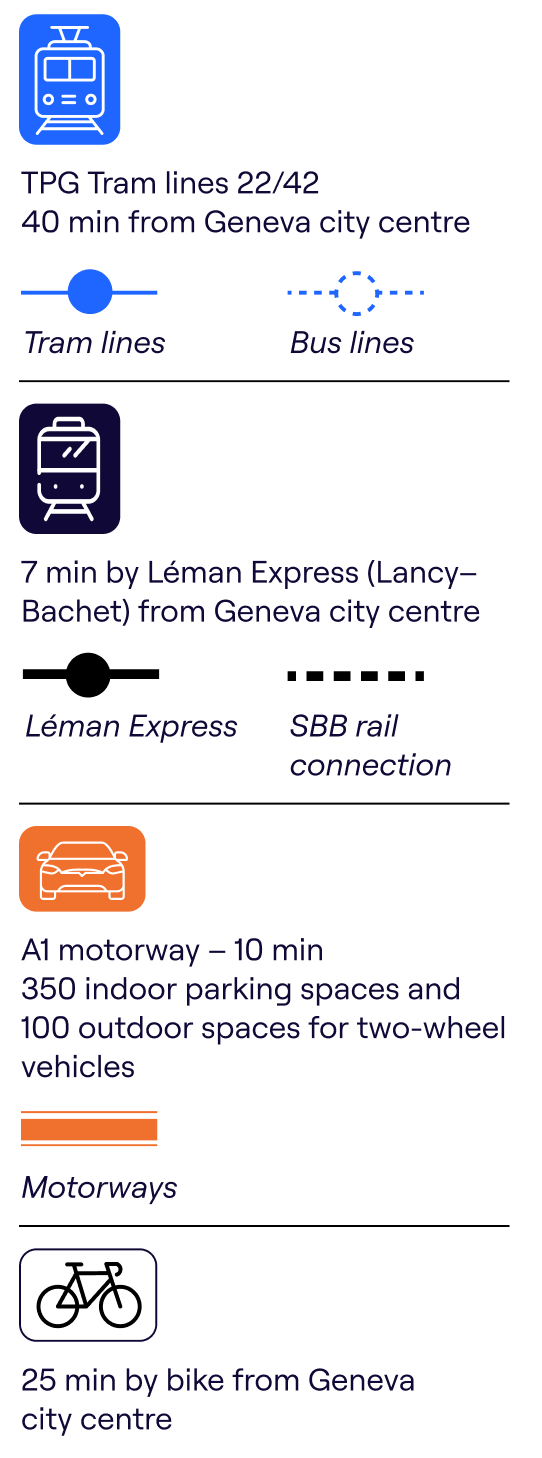 L’Atelier is located at the heart of the 36 ha Plan-les-Ouates Industrial Zone – the epicentre of Geneva’s ‘Watch Valley’ – home to 429 business premises, 12,259 jobs and 188 occupations. It boasts excellent transport links in the form of the A1 motorway and an extensive network of cycle lanes. We urge you to explore this district combining booming business activity with high quality of living – welcome to your new professional playground.